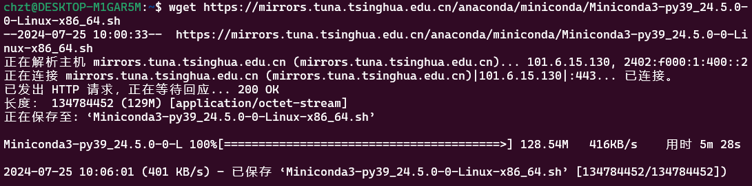 输入命令wget https://mirrors.tuna.tsinghua.edu.cn/anaconda/miniconda/Miniconda3-py39_24.5.0-0-Linux-x86_64.sh,等它下载完毕。