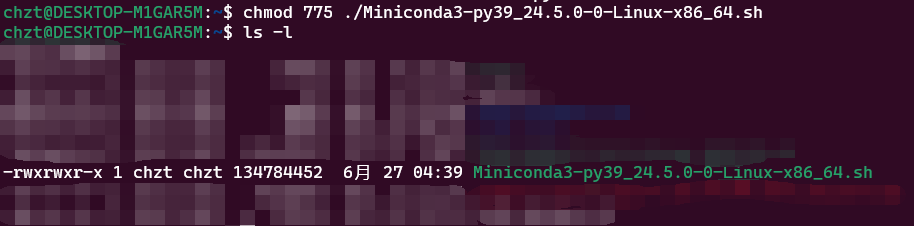 运行命令chmod 775 ./Miniconda3-py39_24.5.0-0-Linux-x86_64.sh,即可完成更改。