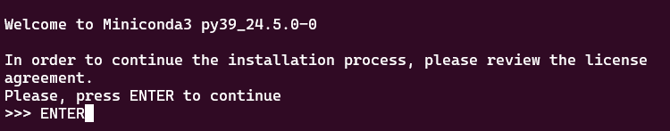 运行命令./Miniconda3-py39_24.5.0-0-Linux-x86_64.sh,执行安装程序。
