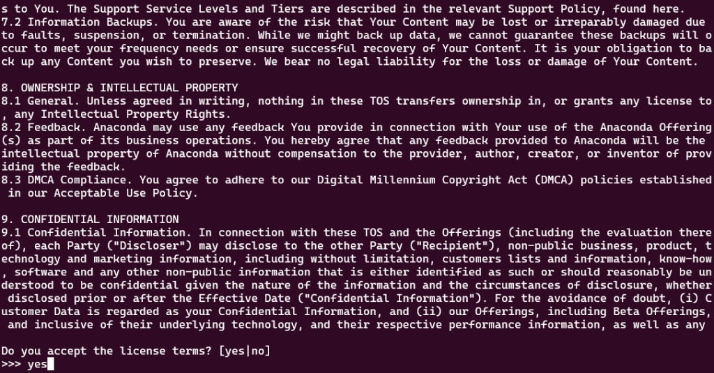 输入yes,接受它的条款。