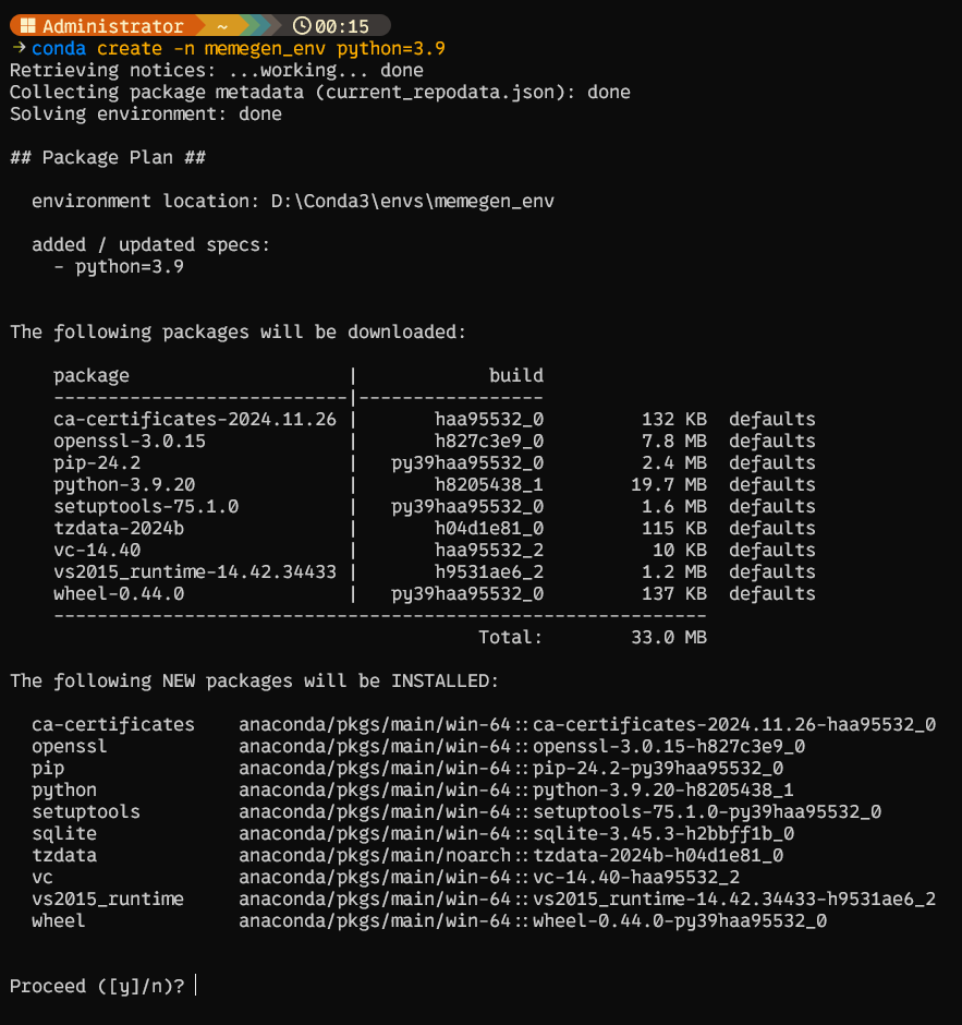 举个例子,我们这次为meme-generator创建一个新环境叫memegen_env,使用Python3.9,就可以用下面这条命令