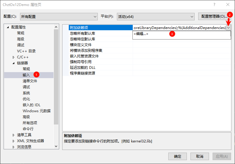 这次点击“链接器” -> “输入” -> “附加依赖项”