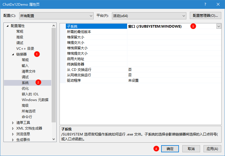 按顺序点击“链接器” -> “系统” -> “子系统” -> 选择”窗口” -> 按”确定”