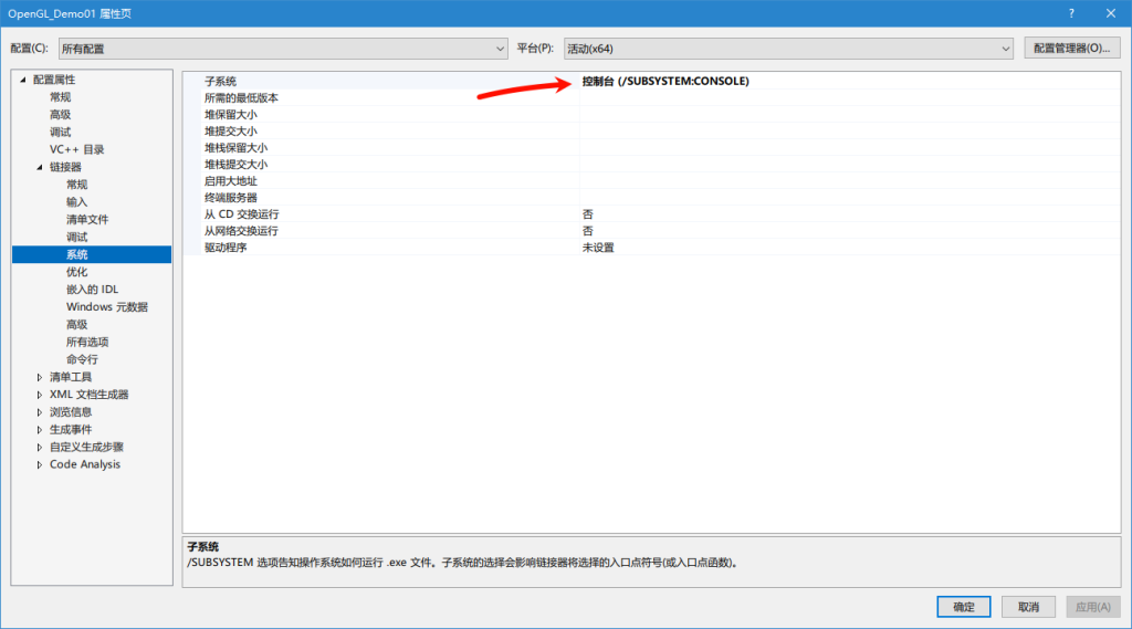 首先创建一个空项目,这没什么好说的,当然你要直接创建一个窗口项目也可以,但是我比较喜欢自己来。空项目默认我指的是控制台项目,就是默认会运行一个黑窗口的exe程序。控制台项目的入口函数是main()函数,而窗口项目的默认入口函数是WinMain()函数。想要把一个控制台项目转换成窗口项目就只需要到“项目属性 – 链接器 – 子系统”里面把控制台切换成窗口就可以了。如图